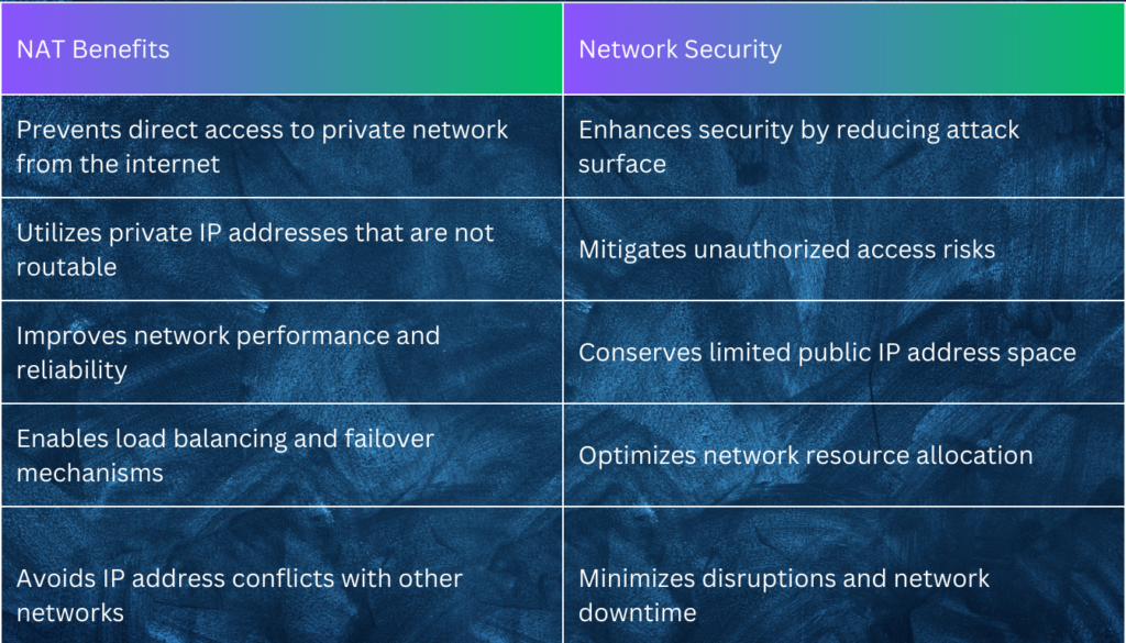 - Implementing NAT improves network performance and reliability.
